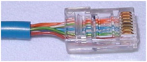 6. CRIMPING THE CABLE ... carefully place the connector into the Ethernet Crimper and cinch down on the handles tightly. The copper splicing tabs on the connector will pierce into each of the eight wires. There is also a locking tab that holds the blue plastic sleeve in place for a tight compression fit. When you remove the cable from the crimper, the cable is ready to use.